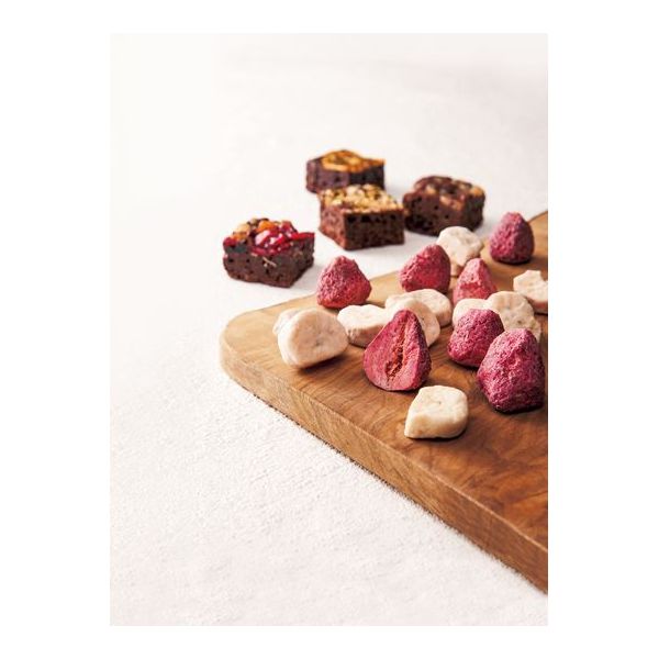 【ギフト対応】 <内祝い お菓子 ギフト>フリーズドライのイチゴやバナナに独自の技術で繊維の中にたっぷりとホワイトチョコレートをしみ込ませた含浸チョコレートと、甘すぎない濃厚なチョコの味わいと、ザクザク刻んだナッツの香ばしさ、ドライフルーツの甘酸っぱさを、ひとくちサイズに焼き上げた果実のブラウニーの詰合せ。