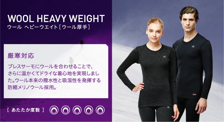 ミズノ ブレスサーモ ウール・ヘビーウエイト クルーネック長袖シャツ A2JA5517 【商品特長】 【素材・サイズ】 サイズ S、M、L、LL 素材 ポリエステル55%・毛36%・指定外繊維(ブレスサーモ)9% 原産国 日本製 JISサイズ S M L LL 身 長(cm) 155〜165 165〜175 175〜185 185〜195 胸 囲(cm) 80〜88 88〜96 96〜104 104〜112 ウエスト(cm) 68〜76 76〜84 84〜94 94〜104 任意サイズ MS(M巾S丈) LM(L巾M丈) LLM(LL巾M丈) 身 長(cm) 155〜165 165〜175 165〜175 胸 囲(cm) 88〜96 96〜104 104〜112 ウエスト(cm) 76〜84 84〜94 94〜104 ※サイズ表には、販売されていないサイズが表示されている場合がございます。